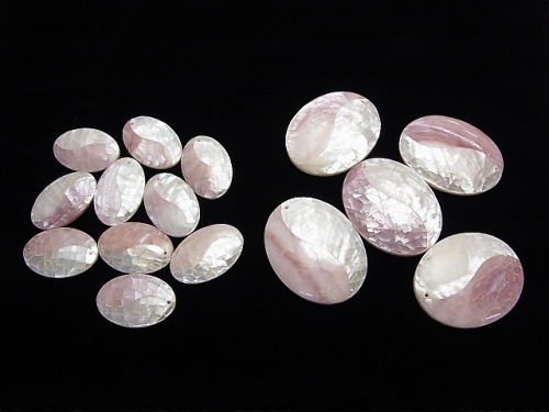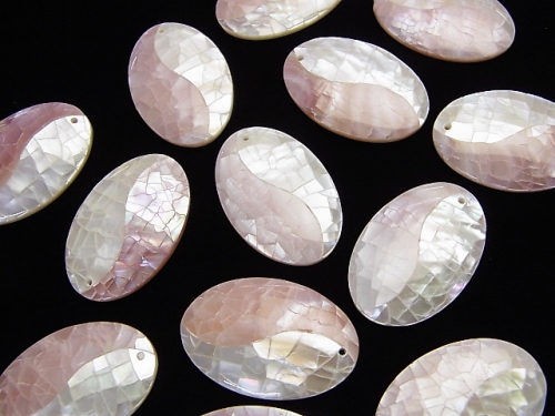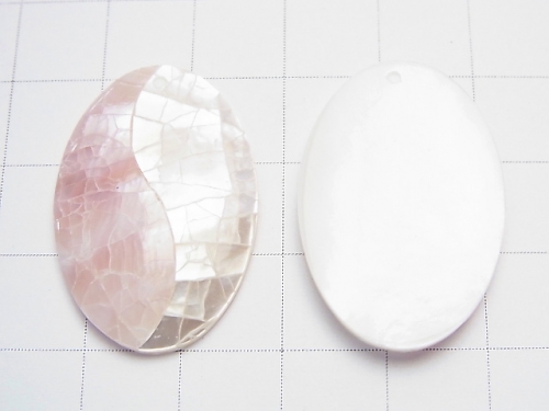 ホワイトとピンクのシェルにクラック加工を施し、 上質なホワイトシェルに貼り付けた手の込んだお品です。 表面は凹凸がなく滑らかな仕上がりになっています。 すっきりとしたオーバル形状、幅広い使用用途が考えられる素材です。