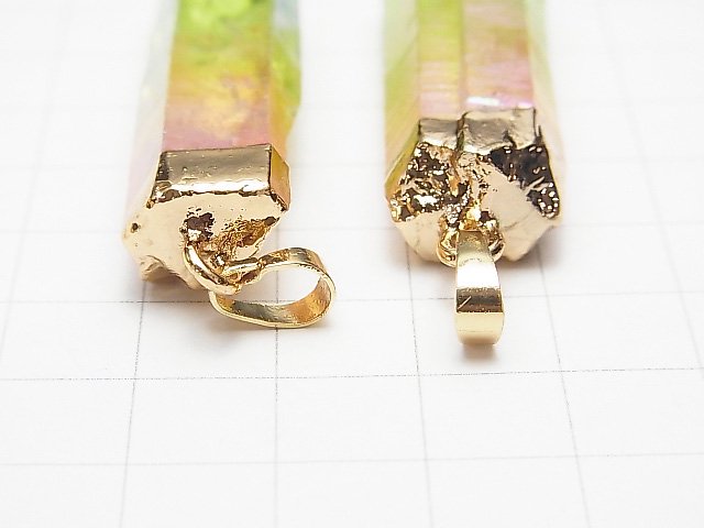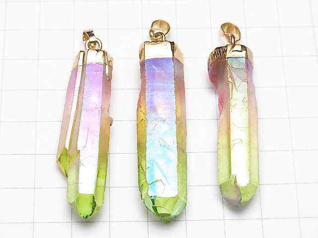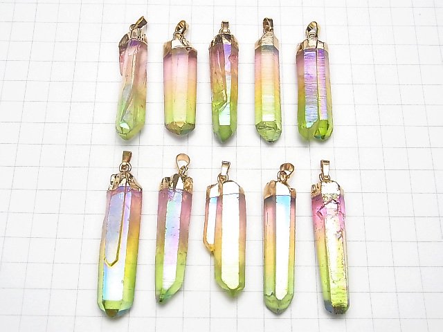 クリスタルのポイント形状のペンダントトップです。天然の風合いを最大に活かした形状に、ピッタリとフィットしたゴールド色の枠で仕上げられています。ピンク〜イエロー〜グリーンのABコーティングが施され、見る角度によってメタリックな輝きが見られます。静止画の方が現物に近い色合いです。画像と合わせてご検討ください。